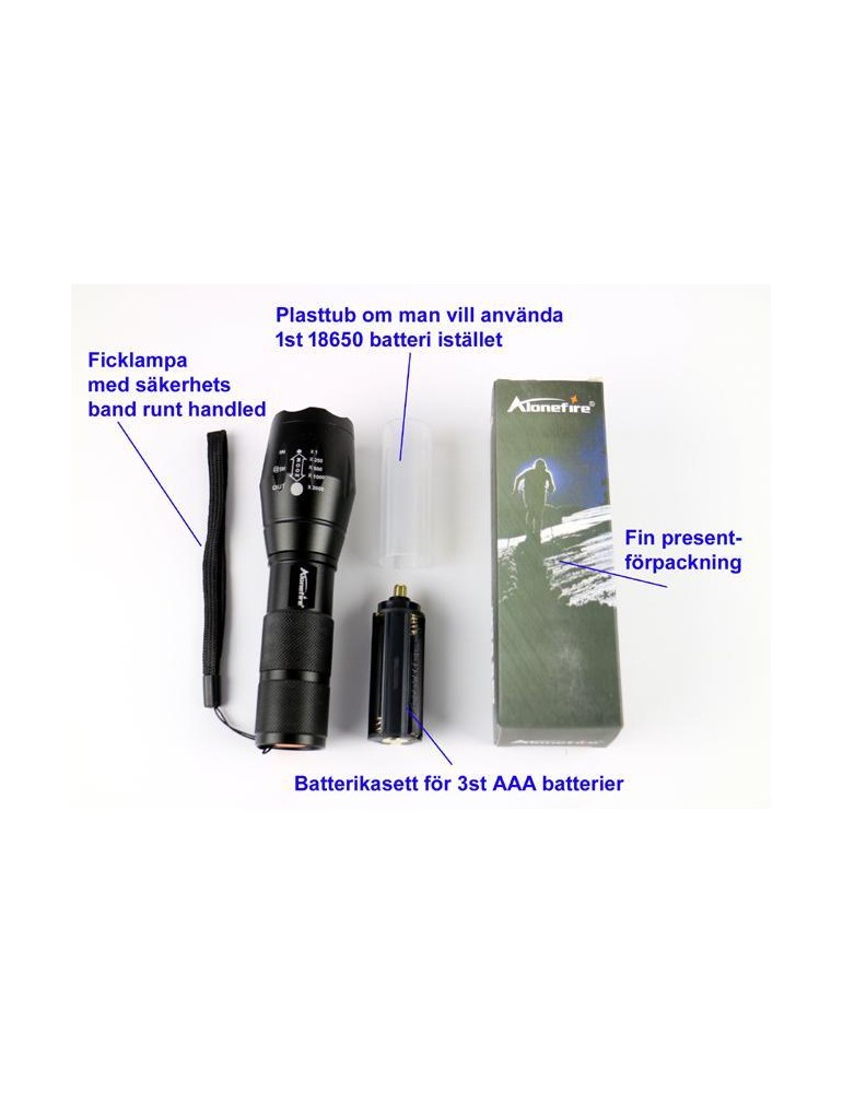 Drivs med 3st vanliga AAA batteri som man sätter i medföljande adapter eller 1st 18650