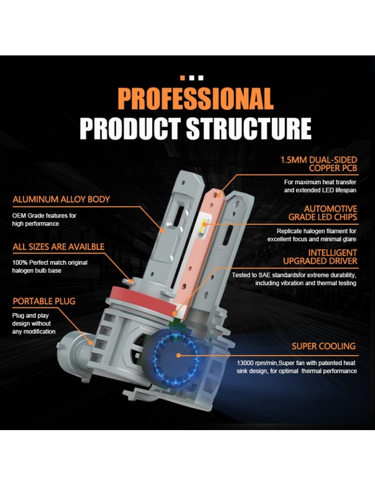 V2 H8 H9 H11 H16(Japan) Led kit till dim el. halvljus med inbyggd fläkt för mer lumen