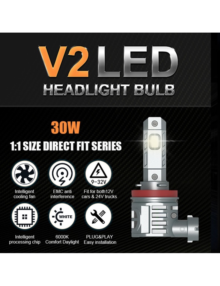 V2 H8 H9 H11 H16 30w Led kit 3000 lumen 6000k med fläkt 2-pack
